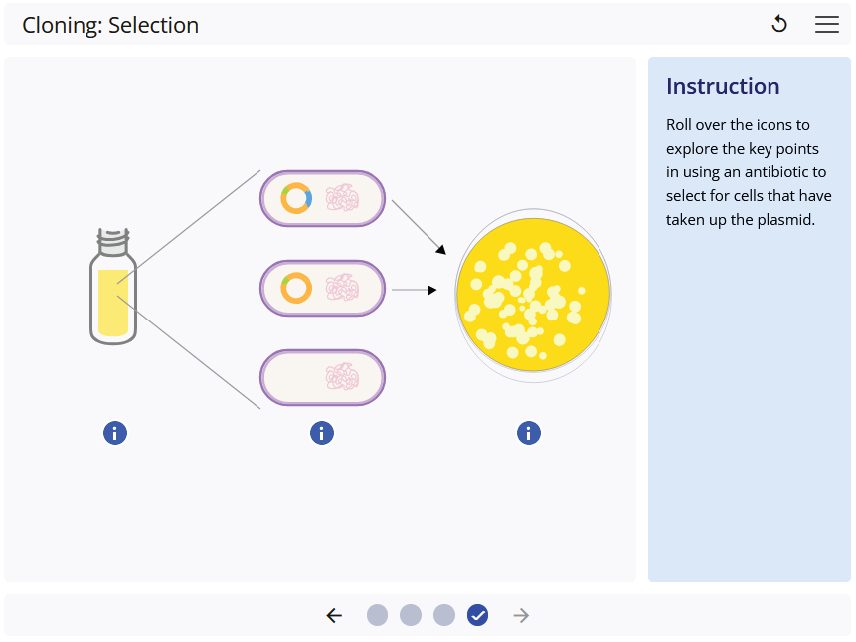 Learn how antibiotic resistance can be used to select for bacteria that have taken up plasmid DNA, and about the key stages in the plasmid selection process. Practise interpreting results from sample agar plates and cloning experiments.