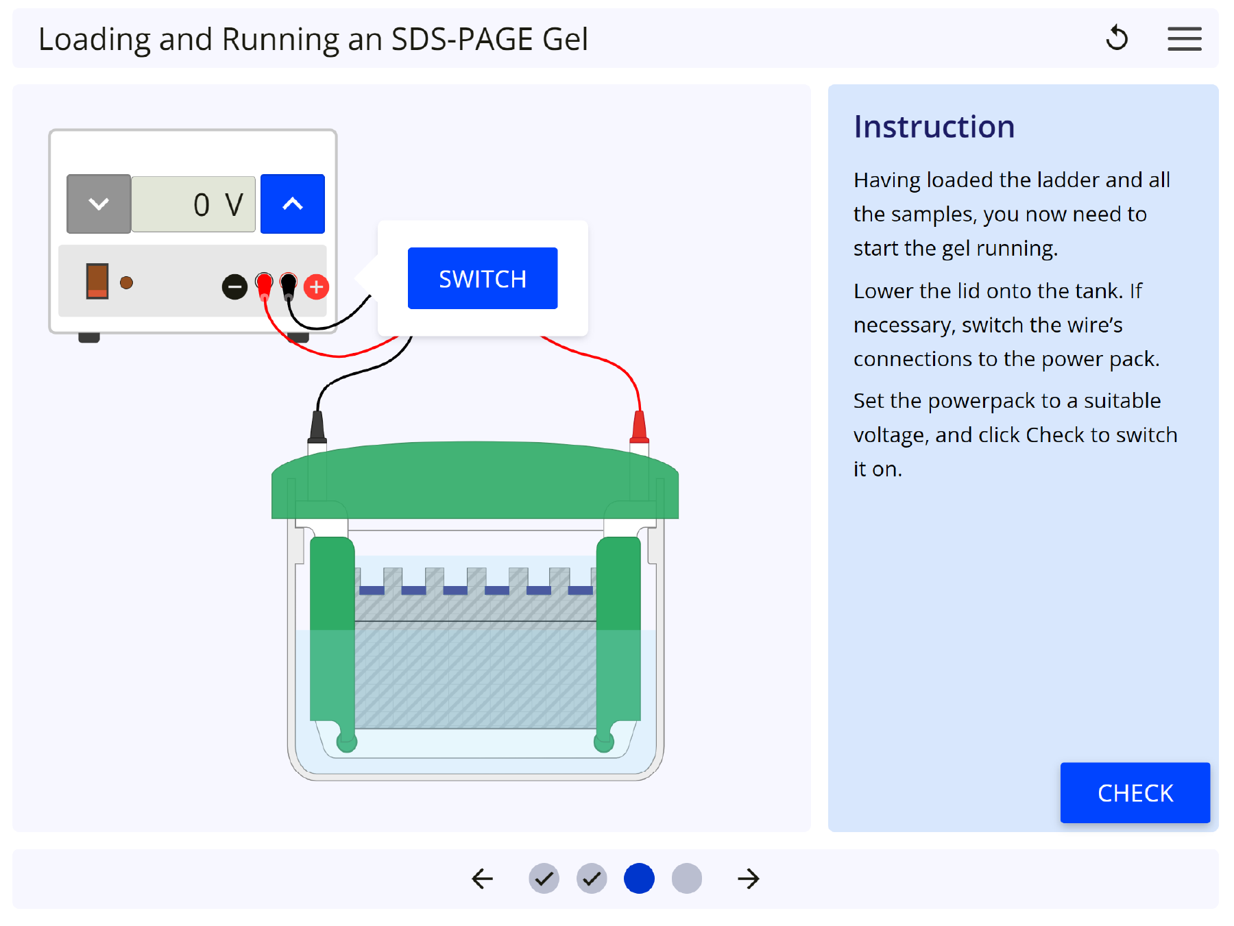 Learn about the steps involved in loading and running an SDS-PAGE gel. Practise loading protein samples, adjusting power pack settings and processing the gel by choosing how best to trim it using a wedge tool.