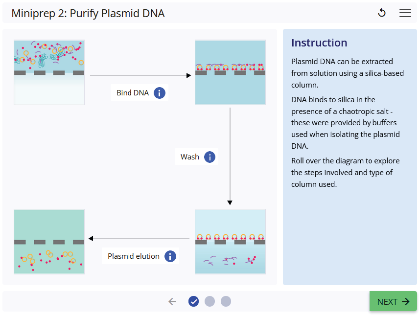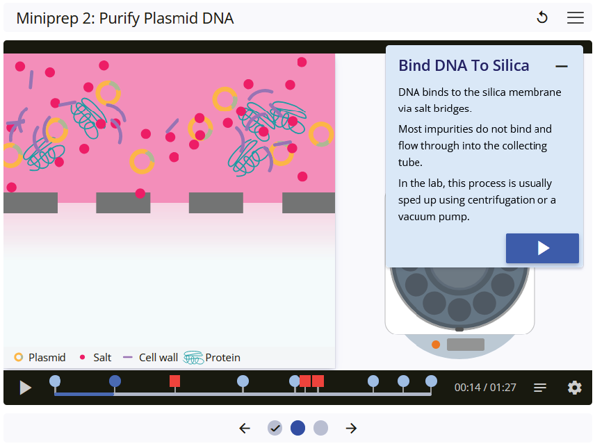 Learn the key steps involved in purifying plasmid DNA in a miniprep protocol. Test your knowledge and understanding with interactive animations and questions.