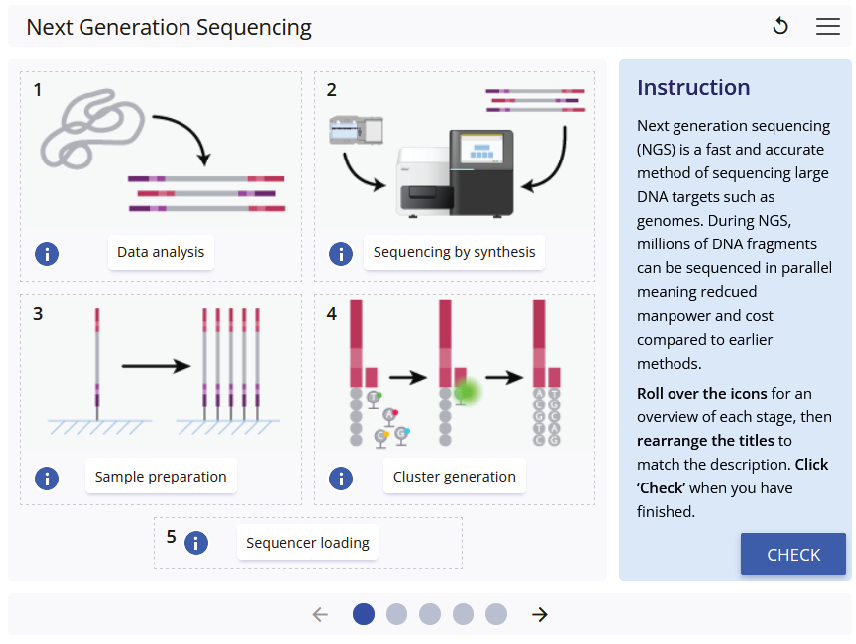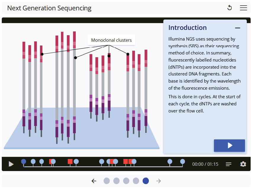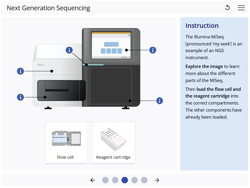 Learn about the main stages of Next Generation Sequencing (NGS), how and why DNA fragments are amplified into clusters and how sequencing by synthesis occurs. Explore how a DNA sample is prepared and practise loading a sample into the Illumina MiSeq.