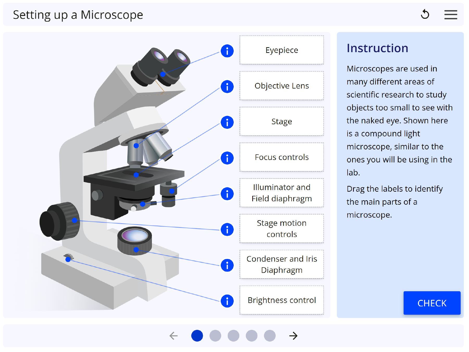 Learn the key components of a microscope. Explore adjusting the brightness, interocular distance, stage height and objective lens to view a sample.